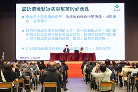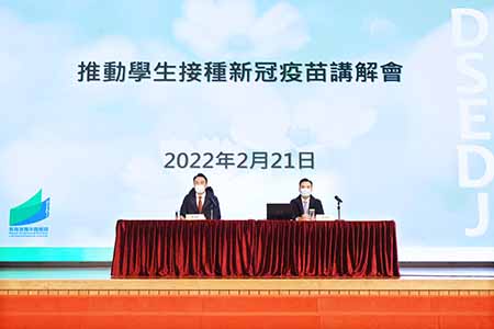 教青局聯同衛生局於昨日(2月21日)下午假教業中學禮堂舉行“推動學生接種新冠疫苗講解會”,教青局局長龔志明、衛生局局長羅奕龍,以及77所非高等教育學校負責人和代表出席講解會。