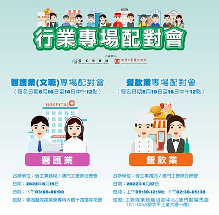 餐飲業配對會將於6月17日舉行(報名日期6月10日至16日中午12點),配對會分上下午兩場,地點為工聯職業技能培訓中心(澳門關閘馬路101-105A號太平工業大廈一樓),參與企業合共8間,提供廚師、廚師助理、餐飲服務員、雜工及水吧等185個崗位。