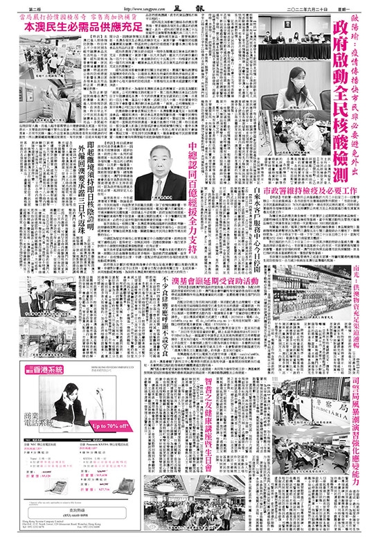 【特訊】昨日經濟財政司司長李偉農表示,因應本次疫情發展,經評估後,政府公佈一系列的經援措施,包括減免及退還多項稅費、推出的士燃料補貼,以及新一輪僱員、自由職業者、商號經營的援助款項計劃等,總預算一百億元。澳門中華總商會會長崔世昌對政府推出援助措施表示支持和認同,認為政府推出措施及時且必要,起到安定人心作用。
