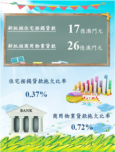 未償還商用物業貸款總額按月上升0.1%,與一年前比較亦上升0.8%,至1,603.4億澳門元;其中,居民部份佔93.5%。居民部份的未償還商用物業貸款按月基本持平,而非居民部份則上升1.9%。