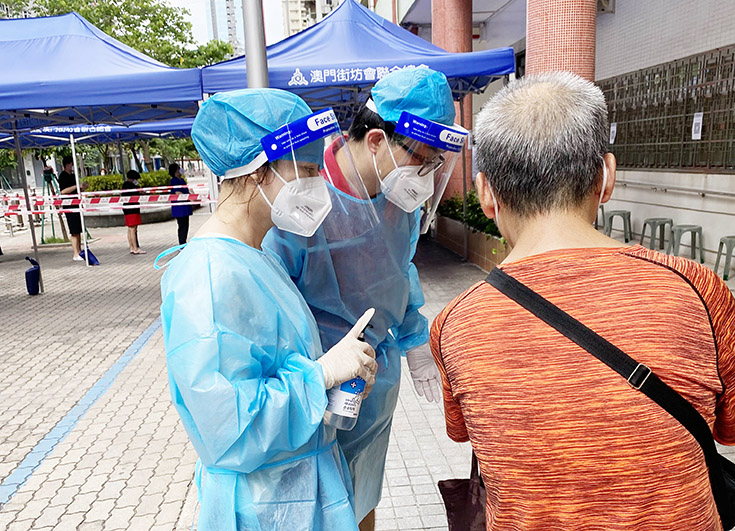近日,澳門中銀義工隊全力支持全民核酸檢測工作,連日來組織動員逾20名義工到街總綠楊核檢站支援,耐心協助到場的市民做好排隊指引、維持秩序,協助檢查預約碼、健康碼、抗原檢測結果等工作,與澳門市民共同抗疫,合力守護家園,為防疫工作貢獻力量。