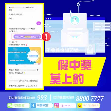 【特訊】司警局近日接獲多名市民舉報,指於網絡社交平台上收到來自友人的訊息,對方以參加一家電公司的抽奬活動為由,要求事主提供手機電話號碼及收到的手機短訊驗證碼,之後更發送一張載有該公司標誌的中奬截圖指事主已中奬,着其提供信用卡資料作領奬之用。事主向對方提供有關資料後,便發現其信用卡資料隨即被不知名網站盜用並造成損失;亦直接聯絡有關友人,但對方表示沒有發出上述訊息且其網絡社交平台帳號早被人盜去。