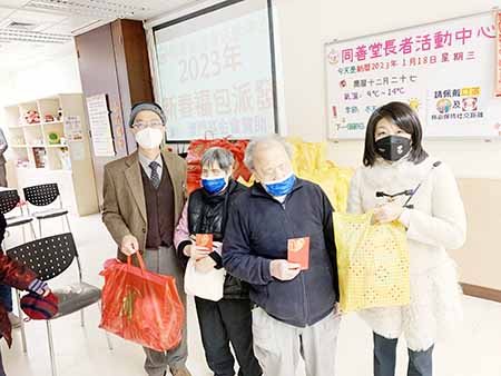 在澳門基金會的大力支持和資助下,活動於一月十七至十九日一連三天在同善堂長者活動中心、氹仔及路環坊眾聯誼會分別進行,該堂副主席馬有友、值理陳少雄及黃珮琳分別向三百七十三名持該堂領物證人士及部分有困難的長者中心會員派送節日福包。受惠人士深感歡欣,表示政府能了解通脹對市民帶來的影響,適時作出紓解民困措施,使澳門市民得到實質的幫助,亦感受到政府及本堂基層人士的關愛,增添節日的歡樂氣氛。