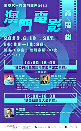 【特訊】由望德堂區創意產業促進會、瘋堂十號創意園主辦,澳門文化發展基金贊助的「瘋堂名人匯系列講座2023──澳門電影新思維」將於2023年6月10日下午14:00-16:30於澳門望德堂區瘋堂斜巷10號-瘋堂十號創意園C01室舉行。