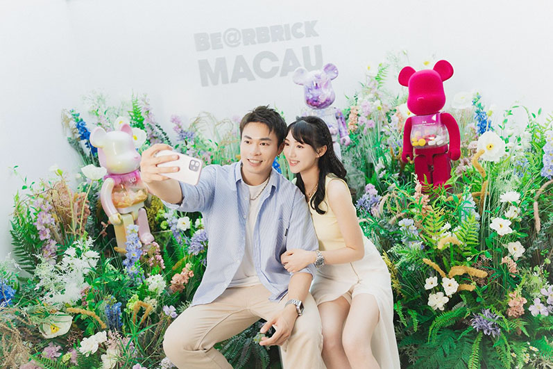 位於明珠大堂的 BE@RBRICK 藝術展則彷如城市中央的小型秘密花園,自然鋪灑的綠植和花卉與科幻感的漸變燈光帶來強烈的視覺衝擊,一共 12 套的 BE@RBRICK MACAU 2023全新系列穿梭其中,引導觀眾尋找內心的「綠野仙踪」。現場還設有互動環節,觀眾可以通過掃描二維碼到達活動頁面領取和使用以三個 BE@RBRICK MACAU 2023 全新系列藏品為設計元素的主題濾鏡,亦可以拍攝和打印帶有 BE@RBRICK 元素的照片作為觀展紀念品。不容錯過的打卡之選還有設置於近鑽石大堂的戶外草坪、超過 7 米高的全球首個MY FIRST BE@RBRICK B@BY 10000 %充氣藝術裝置,佇立於「澳門銀河」標誌性的金色 築群前,搭配澳門夏日的清朗天氣,即可輕鬆拍得引爆社交平台的潮流藝術大片。