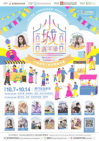 “小城旅遊文創消費嘉年華” 將於10月7日至14日下午4時至晚上8時,一連八天在友誼廣場舉行。約20個澳門原創品牌及特色小店匯聚於市集,配以攤位遊戲、文創體驗工作坊、主題互動佈置、舞台表演及消費指南設計作品主題展覽,豐富的活動體驗促進“旅遊+文創”跨界融合。活動亦將推出“齊來小城消費微信小遊戲",參加者有機會贏取商戶電子現金券或實體禮品。