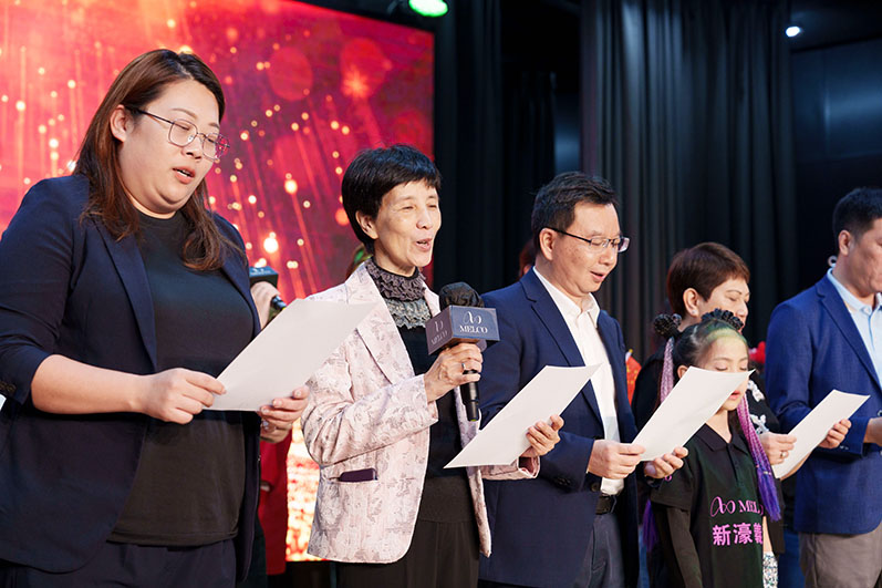 中聯辦社工部副部長趙河清、工聯總會會長何雪卿、新濠主席兼行政總裁何猷龍、工聯總會理事長李從正、新濠執行副總裁兼首席事務長高橋明子、博彩企業員工協會副理事長馮少婷及博彩業職工之家理事長李冠禧共同主禮文藝晚會之開幕禮。