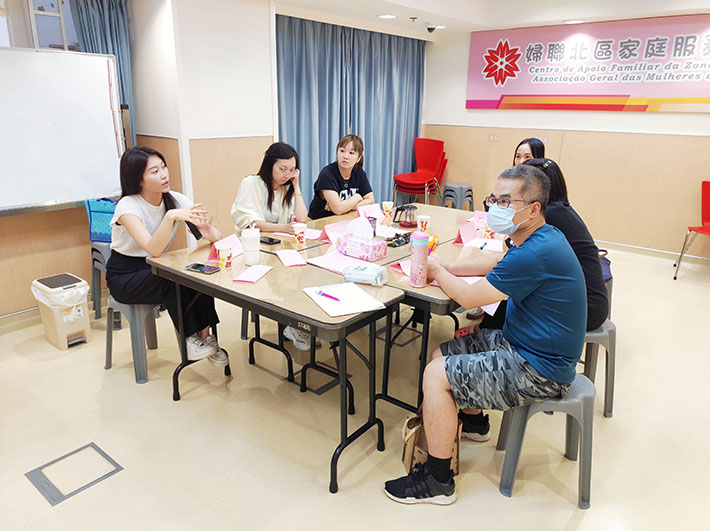 在家長組中,小組以促進家長從自我檢視管教模式為主題,讓家長於日常生活情境中了解自身慣用的管教模式,以及與子女之互動關係。有家長分享自身使用的管教模式,引發其他家長的認同及反思。為此,中心註冊社工帶出6A管教法則,以啓發家長學習教育子女心法達成恩威並施的管教模式,包括接納(Acceptance)、關愛(Affection)、讚賞(Appreciation)、時間(Availability)、責任(Accountability)及權威(Authority),以及如何在生活中具體執行和實踐。