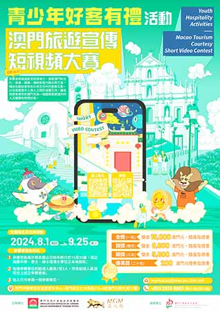 “青少年好客有禮活動 — 澳門旅遊宣傳短視頻大賽”由旅遊局與美高梅共同舉辦,澳門中華新青年協會承辦。有關比賽章程詳情,請掃瞄海報二維碼或瀏覽旅遊局網站(https://ep.macaotourism.gov.mo/contest-macao-courtesy-2024)。