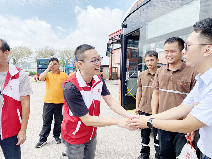 工聯總會副會長、立法會議員李振宇,工聯總會副理事長、立法會議員李靜儀,澳門交通運輸業總工會副理事長鄺熾明、鄭華章,澳門教車業職工會理事長毛偉然、副理事長鄭北贊、澳門公共巴士職工總會副理事長黎國雄、何庭光,工聯權委副主任林翔宇等一行,日前帶著冰鎮能量飲品、清涼貼等防暑物品,先後前往氹仔的輕型汽車及重型汽車教考車場,新福利車場及澳巴車場將慰問物品送到教車人員、巴士維修員等職工的手上。