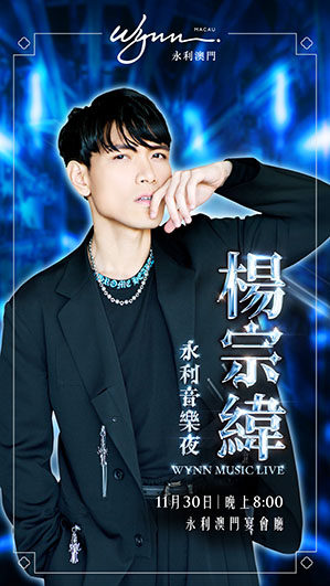 楊宗緯「永利音樂夜」詳情: 日期:11月30日 時間:晚上8時 地點:永利澳門宴會廰。