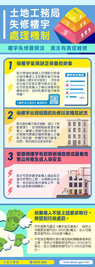 現時土地工務局對失修樓宇的處理機制,主要是透過日常巡查、市民投訴或其他部門轉介,派員到現場對樓宇狀況進行檢查,從而對樓宇的失修狀況作出初步評估,並制訂對應的跟進處理方式。