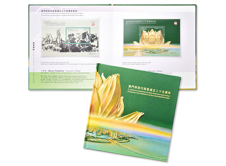 至於「澳門特別行政區成立二十五周年」專題郵摺,載有七套澳門回歸系列郵品,包括澳門特區成立紀念、一周年、五周年、十周年、十五周年、二十周年及二十五周年的郵票及小型張各一套。郵摺採用精裝印製,封面取材自「澳門特別行政區成立二十五周年紀念」郵品的設計元素,以蓮花為主要題材,寓意澳門在祖國支持下繼續繁榮穩定發展,步向美好明天。每本售價為三百三十元。