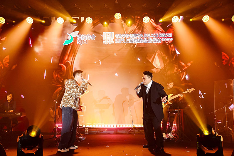 香港著名歌手蘇永康和梁漢文為歌迷帶來多首個人經典情歌,包括蘇永康的《愛一個人好難》、《那誰》和梁漢文的《七友》、《纏綿遊戲》等,打動粉絲的心。兩位亦合力演繹《拔河》等金曲,讓每位歌迷都投入放聲高唱。兩人更施展渾身解數,和歌迷親密互動,現場氣氛高漲。兩位紛紛表示好開心今年再次來上葡京為粉絲獻唱,十分感謝歌迷支持,更預祝大家新年快樂。