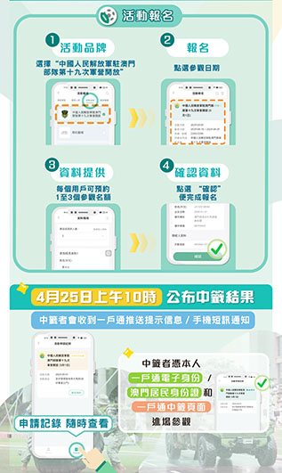 5月1日、3日參觀名額各2200個,每名“一戶通”用戶可以預約1至3個參觀名額。登記過程簡易便捷,用戶登入“一戶通”後,於“服務”中點擊“活動報名”,進入“活動品牌”頁面後,選擇“中國人民解放軍駐澳門部隊第十九次軍營開放”,選擇參觀日期並填妥相關信息,即完成預約登記。