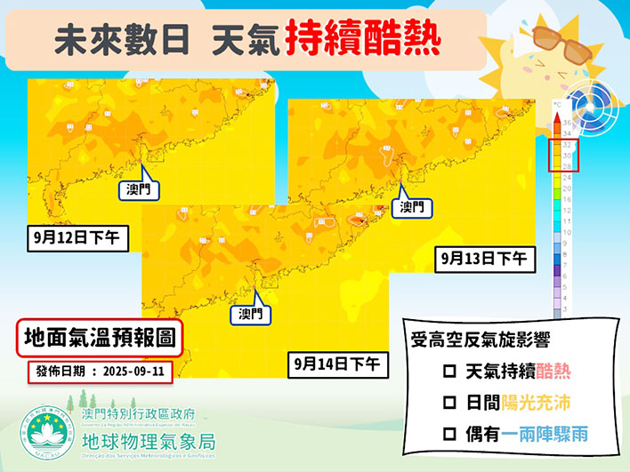 氣象局表示,本週日(九月十四日)便是二零二五年立法會選舉投票日的大日子,受高空反氣旋影響,未來數日風力較弱,日間天氣酷熱,最高氣溫達三十三度,巿區會再高一兩度。九月十四日投票日當日,初時或有一兩陣驟雨,但日間陽光充沛,天氣酷熱。因此,巿民積極外出參與選舉活動,踴躍行使投票權利之餘,可參考以下天氣錦囊,做好防暑準備。