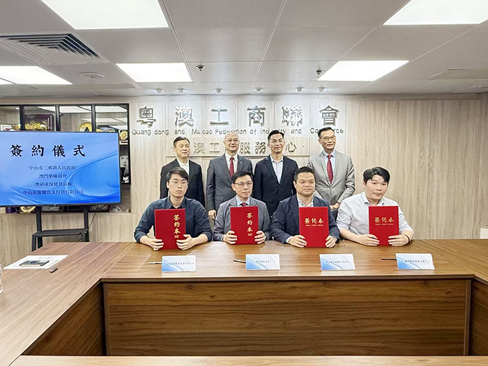 隨後,中山市三鄉鎮鄭志宏副鎮長、澳門藥廠商會蔡健華會長、澳研康保健食品廠蔡浚傑董事、中山市龍耀實業投資有限公司方俊濠總經理,分別代表各方簽署“澳藥粵制”合作框架協議,四方將聯合打造“澳門品牌,三鄉製造”產品,攜手推進粵港澳大灣區大健康產業的創新發展。施家倫、冼智前、黃仁民、方海水見證簽約。