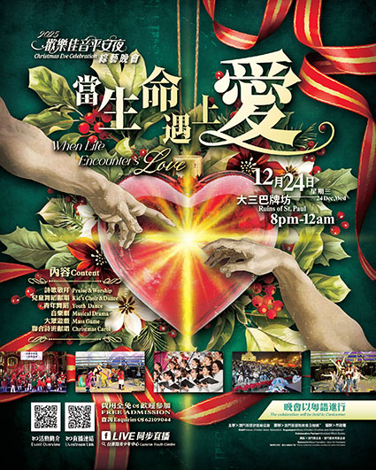 【特訊】 由澳門基督徒音樂協會主辦,十多個基督教教會及機構聯合籌辦,市政署協辦,澳門基金會、澳門霍英東基金會資助之「二零二五歡樂佳音平安夜」綜藝晚會,定於本年十二月廿四日(星期三),平安夜晚上八時至十二時假大三巴牌坊耶穌會廣場舉行。