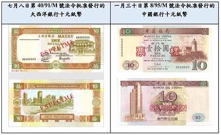 【特訊】根據六月一日第117/2015號行政長官批示,七月八日第40/91/M號法令批准發行的大西洋銀行十元紙幣以及一月三十日第8/95/M號法令批准發行的中國銀行十元紙幣(見附件圖)的回收期將於2018年5月26日結束,澳門金融管理局謹此呼籲,持有上述十元紙幣的人士請於上述之最後回收期內前往相關發鈔銀行兌換紙幣,於上述回收期屆滿後,中國銀行及大西洋銀行將不再回收題述紙幣。