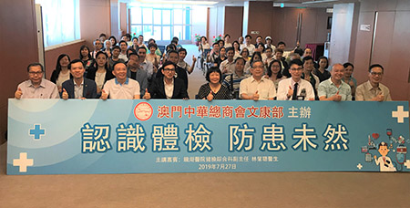 【特訊】澳門中華總商會文康部為推動委員們關注自身健康,增加相關的醫學常識,日前在鏡湖醫院霍英東博士醫療大樓荷花廳舉行《認識體檢 防患未然》講座。邀請鏡湖醫院健檢綜合科副主任林肇聰醫生擔任主講嘉賓,出席健康講座的有鏡湖醫院行政院長吳培娟,中總副理事長黃樹森,文康部部長陳志杰,副部長林偉濠、勞灼榮、崔家榮等。