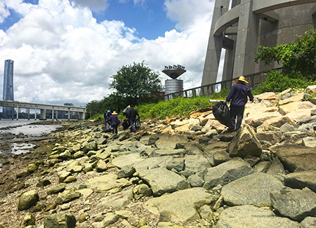 昨日的潮汐上午至中午的預測潮高最低只有約一米,沿岸石灘和石堤有大部分面積露出水面,有利開展沿岸垃圾的清理工作。為此,海事局協調海上清潔的外判公司清理觀光塔至西灣大橋一帶沿岸石灘和石堤上的垃圾。