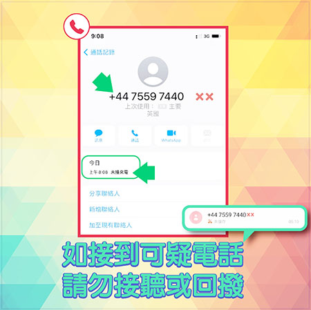 【特訊】昨日早上司警局分別接獲大廈防罪之友及多名市民舉報,稱接獲國際區號為+44 75597440XX,顯示來自“英國”的來電,來電時只響一聲就掛線,懷疑是電話詐騙。司警局呼籲市民必須加強防範,切勿接聽或回撥可疑來電,勿讓騙徒有機可乘。