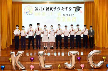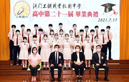 【特訊】澳門工聯職業技術中學(下稱「工聯職中」)於學校禮堂分場次舉行2020/2021學年畢業典禮,包括第二十一屆初高中、第二屆幼稚園、夜校第九屆高中畢業典禮。澳門工會聯合總會會長何雪卿,副會長林倫偉,副會長、工聯職中校監馮家輝,副理事長梁孫旭、李靜儀、李振宇、趙蘭瑛,校長呂吉實,澳門中國銀行總監林梅玉、新華三集團有限公司高級網絡技術工程師何奕寧等主禮嘉賓出席活動並向本屆合共近240位畢業生頒授文憑及獎項。畢業生與親友、教職員歡聚一堂,共同見證開啓人生新征程的重要時刻。