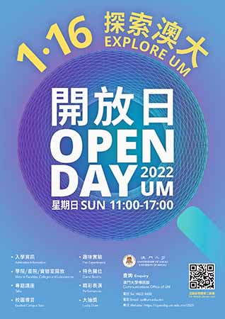 開放日開幕式將於當日上午11時在澳大聚賢樓(N1)多功能廳舉行;開放日則由上午11時至下午5時在澳大校園舉行,各教學設施將開放探索。各間學院、書院、實驗室、圖書館、體育館等均有專人在場,詳細介紹其特色和設施;同時設多個諮詢展位,全方位呈現各學系的課程內容,有意到澳大升學的學生可按個人興趣到心儀的學系,了解更多課程的特色。歡迎有興趣的學生和家長到場了解更多入學資訊,為參加“澳門大學入學考試"及“澳門四高校聯合入學考試"(1月5日起接受報名)做好準備。