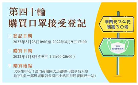教青局將於2022年4月8日至9日期間(每日上午11時至晚上8時)在大學生中心(澳門荷蘭園大馬路68-B號華昌大廈地下B座,在盧廉若公園巴士站對面)設置口罩售賣點。屆時受託人按預約日期及時段前往大學生中心,向現場工作人員出示其身份證正本及由本局發出之確認短訊,便可購買口罩。