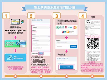 為進一步配合特區政府電子政務的發展,由5月1日起,體育局將增設網上購買游泳池即場門票服務。於游泳池每節開放前30分鐘開始,市民可憑本人身份證明文件或運動易會員卡,透過體育局網頁www.sport.gov.mo「場地預約及購買門票」中的「購買游泳池即場門票」或手機應用程式,揀選欲前往的游泳池、填妥個人資料並進行電子支付,即可購買游泳池即場門票。市民可自行下載門票,而體育局亦會以短訊形式發送門票至購票時填寫的流動電話號碼。另外,由於十二歲或以下小童須由年滿十八歲或以上人士一同購票及陪同游泳下方可使用泳池,故每名年滿十八歲或以上人士亦可於系統中添加最多兩名十二歲或以下小童一併購票。