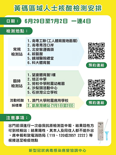 黃碼人士可透過以下連結:https://eservice.ssm.gov.mo/allpeoplernatestbook預約到上述地點進行核酸檢測,亦可在以下連結預約到各個常規核酸檢測站進行免費核酸檢測:https://app.ssm.gov.mo/mandatoryrnatestbook ,核酸檢測結果不會上載至澳門健康碼,亦不可作為出入境用途。