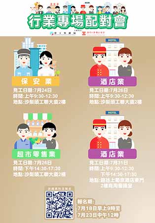 7月31日全日舉辦酒店業配對會,提供19個職位空缺,涉及行政及支援助理經理、禮賓主任、助理禮賓司、度假村服務專員、前臺服務員及管家部調度員等。配對會在澳門上葡京2樓商周會議室舉行。