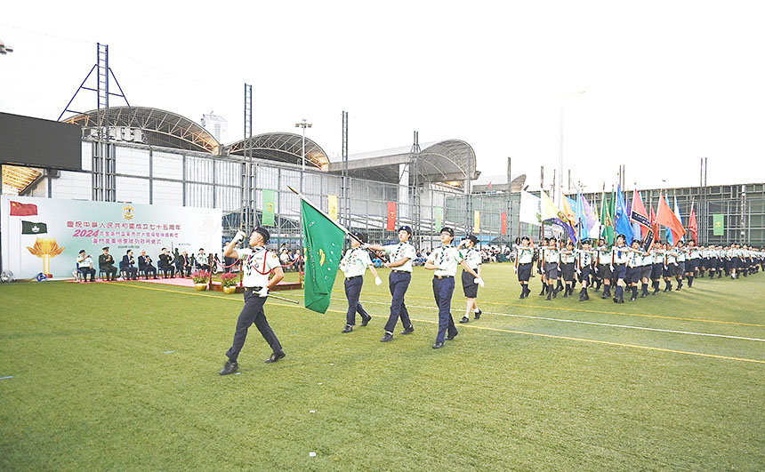 【特訊】澳門童軍總會昨在關閘工人體育場舉行「慶祝中華人民共和國成立75周年、2024年度澳門童軍周年大匯操暨頒獎典禮及澳門童軍總會隊列啟用儀式,行政長官代表、保安司司長黃少澤,中聯辦教育與青年工作部部長李雪飛,外交部駐澳特派員公署參贊郭曉峰,中國人民解放軍駐澳門部隊副參謀長劉歡,澳門童軍總會理事會主席梁少陪、澳門總監周成俊、 監事會主席梁顯方等嘉賓出席主禮並作勉勵。梁少培勉勵全體童軍再接再厲,表示童軍總會將繼續薪火相傳,積極配合特區政府依法施政,確保「一國兩制」在澳門的實踐行穩致遠。為國家、為澳門培育更多有理想、敢承擔、負責任的年青人,共創澳門更美好的未來。