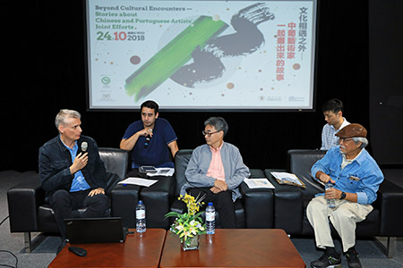 梁煜輝首先介紹國畫署名與落款慣例的一些知識,並提出他與André Aveline António等藝術家在這慣例中摸索出來的「西文題字"的藝術遊戲。André Aveline António接著以具體畫作為例,介紹在國畫上用葡文與義大利文落款的創新實驗。他還分享他在藝術之外的「中葡交融"的經驗與趣聞。旅居澳門的葡萄牙建築師、畫家Gonçalo Cardoso de Menezes以他的人面神獸系列畫作為例,解釋他如何將中國神話故事裡的動物圖像、澳門寺廟香爐上的神獸、門口的獅子石像等融入西方人面神獸的繪畫中。