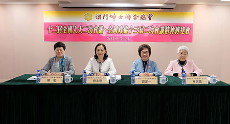【特訊】婦聯總會昨晚舉行“十三屆全國人大二次會議、全國政協十三屆二次會議精神傳達會”,四名身兼全國人大代表或全國政協委員的該會負責人出席,向逾四百名婦女工作者介紹“兩會”情況,期望藉此加深本澳婦女工作者對國家發展和政策的認識,深入學習領會“兩會”精神,抓好並用好粵港澳大灣區建設等國家戰略為澳門帶來的機遇。
