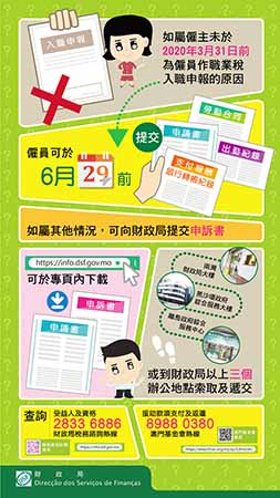 【特訊】《僱員、自由職業者及商號經營者援助款項計劃》中按第19/2020號行政法規第七條的例外規定,亦即是沒有在法定期内作職業稅入職申報,但符合例外規定於2019年1月1日至2020年3月31日期間受僱於他人的僱員,須於6月29日前向財政局提交有關僱員援助款項的申請書,否則逾期申請將不獲受理。