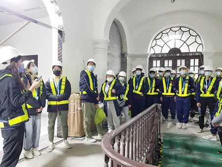 分享會後隨即前往聖庇護十世音樂學院工地視察,原址為利瑪竇小學,屬老式葡萄牙莊園式建築,被評定具建築藝術價值之樓宇,故保留外牆及門窗頂部的圓形浮雕及花環,期間需克服不少建築上難題。接著工業安全主任帶大家實地參觀,並細心講解樓宇結構、窗頂浮雕修建、天花施工技術、排氣裝置等工序。參加者認為是次活動能加深對業界及行業具體工作的認識,這為日後職業生涯發展方向提供參考,期待教青局將來舉辦有更多相關的活動。