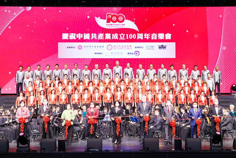 “慶祝中國共產黨成立一百周年音樂會”在莊嚴的奏唱國歌儀式中揭開序幕,全場齊唱國歌,畫面動人心扉。婦聯合唱團以飽滿的激情先後演唱一系列經典愛國歌曲,包括《在燦爛的陽光下》、《前進吧中國共產黨》、《最美的歌兒獻給媽媽》、《媽媽教我一支歌》及《没有共產黨就没有新中國》;管弦樂團激昂演奏《人民軍隊忠於黨》及《保衛黃河》;澳粵著名歌手樊雅靜、陳建華、李渭成、陳斯妍深情演唱《唱支山歌給黨聽》及《我和我的祖國》,歌樂齊鳴,以悠揚的歌聲及動人的旋律演繹了對中華民族奮鬥時代的自豪之情,以及對美好生活的讚頌與願景。