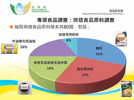 近年興起在家烘焙,不少市民會自行購買烘焙食品原料進行加工製作。然而,烘焙食品原料若生產或貯存不當,可能會受到真菌毒素、重金屬污染或含有過量防腐劑。為保障市民食用安全,市政署展開烘焙食品原料專項食品研究調查,於本澳超級市場、百貨公司、烘焙材料店等售賣烘焙食品原料的地點抽取共八十個樣本,包括麵粉、預拌粉、奶粉、牛油、可可醬、烘焙食品裝飾等,進行了總砷、鉛、黃曲霉毒素B1、黃曲霉毒素M1、苯甲酸、山梨酸、二氧化硫、沒食子酸丙酯、特丁基對苯二酚、叔丁基對羥基茴香醚、二丁基羥基甲苯及三聚氰胺檢測。結果顯示,所有樣本均未見異常。