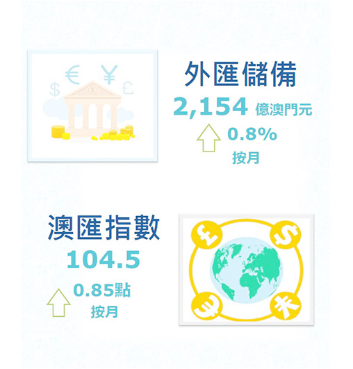 2022年3月的貿易加權澳匯指數為104.5,較上月及去年同期分別上升0.85點及1.28點,顯示總體來說,澳門元兌澳門主要貿易夥伴的貨幣出現上浮的情況。