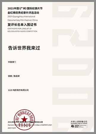 【特訊】由本地導演侯婕、陳庭婷執導之紀錄片《告訴世界我來過》入圍今屆中國(廣州)國際紀錄片節,該紀錄片為本澳首部於香港進行院線發行上映之紀錄片,現再創佳績令人鼓舞!