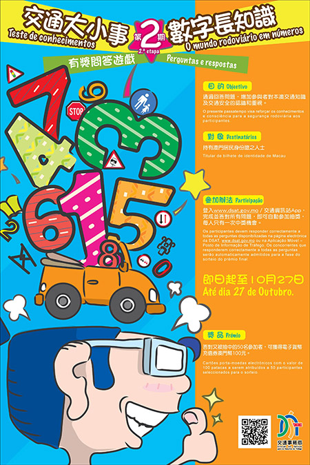 交通事務局為持續向市民推廣交通安全,加深他們對本澳交通知識的認識,共建良好的出行環境,推出「交通大小事 數字長知識」第二期有獎問答遊戲,參加者只要答對所有問題,便可自動參加抽獎獲取獎品以作鼓勵,詳情可瀏覽交通事務局網頁www.dsat.gov.mo或致電交通事務專線8866 6363查詢。