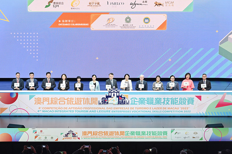 「第四屆澳門綜合旅遊休閒企業職業技能競賽」昨日假美獅美高梅劇院舉行啟動儀式,由行政長官代表經濟財政司長李偉農、中聯辦副主任嚴植嬋、廣東省總工會副主席杜玲、勞工事務局局長黃志雄、工聯會長何雪卿、澳娛綜合常務董事兼福諮會主席梁安琪、銀河娛樂集團人力資源及行政集團董事呂慧玲、金沙中國總裁王英偉、新濠博亞首席顧問黃昇雄、永利澳門副主席兼執行董事陳志玲、美高梅總裁及首席營運官王志琪、勞工事務局副局長陳元童和活動籌委會主任蔡錦富主禮。