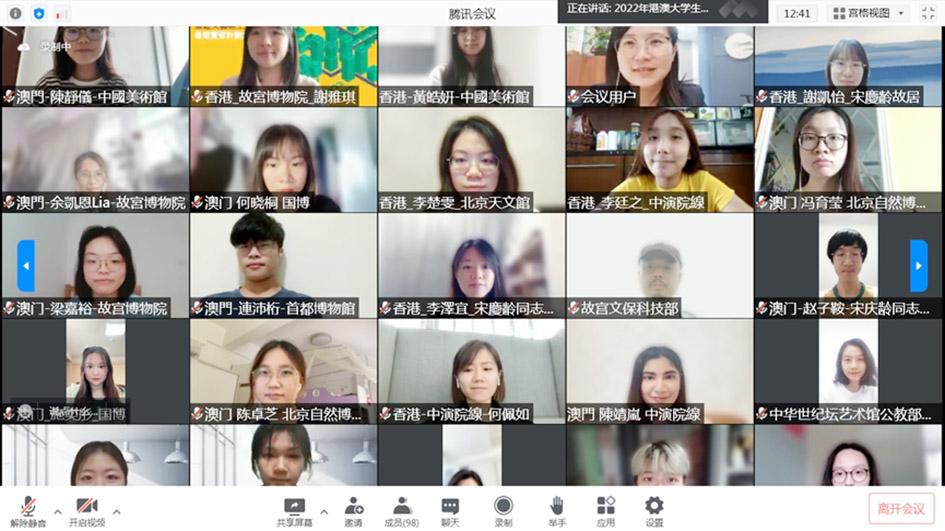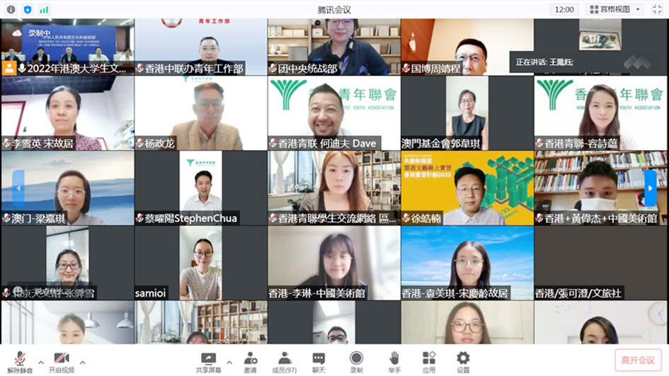 【特訊】由文化和旅遊部港澳台辦、全國青年聯合會秘書處、香港中聯辦青年工作部、澳門中聯辦教育與青年工作部、香港青年聯會、澳門基金會共同主辦的2022年“港澳大學生文化實踐活動”於 7月18日下午2點舉行線上開幕式。各主、承辦單位和相關實習機構代表共同參加。文化和旅遊部國際交流與合作局局長高政、香港青年聯會主席楊政龍、澳門基金會主席吳志良、國家博物館及宋慶齡故宮代表、港澳實習生代表分別致辭。