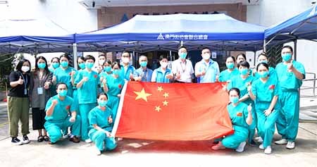 由珠海市組派的兩批廣東省援澳採樣隊醫護人員共六百五十人,由本澳第四輪全民核酸檢測起,便分散至各個核檢站,與澳門各界並肩作戰,至本週末的第十四輪全民核檢完成後將返回內地。臨別在即,援澳醫療隊隊長、珠海市衛生健康局副局長柴宏亮,副隊長、珠海市衛生健康局四級高級主辦楊衛國一行約三十位援澳醫護人員昨日(廿七日)到訪街坊總會,由街坊總會會長吳小麗、副會長何潤生、理事長陳家良、副理事長兼秘書長莫偉成熱情接見,雙方展開親切的交流以及互贈紀念品以作留念。