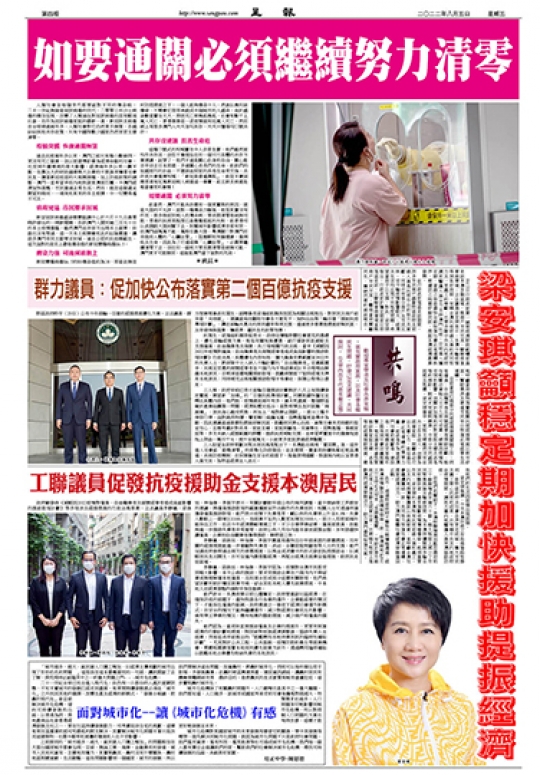 三人盼望在政府果斷決策及居民高度配合下,本澳能在兩周「鞏固期」後,逐步進入社會面「動態清零」的常態化防控階段;在此期間,冀當局持續與鄰近地區溝通,共商防疫機制,在保障衞生安全的前提下,推進便利通關,恢復與內地以至香港人員交流,為特區經濟注入活水。