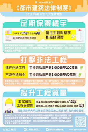 在打擊非法工程方面,訂定非法工程所在場所業權人及施工人員的相關責任,加大違法的罰款,並引入包括物業登記附註及中止水電供應等多種針對嚴重個案的措施,藉以提醒並推動市民主動處理自身單位的僭建物,合力維持建築物良好的使用條件。
