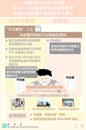 截至2022年8月23日,財政局分別收到2,274份申請書及2,938份申訴書,財政局將根據個案的具體情況儘快作出核實,居民可於專頁(https://info.dsf.gov.mo)登入系統,查詢申請或申訴的處理進度及審批結果。