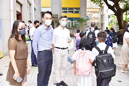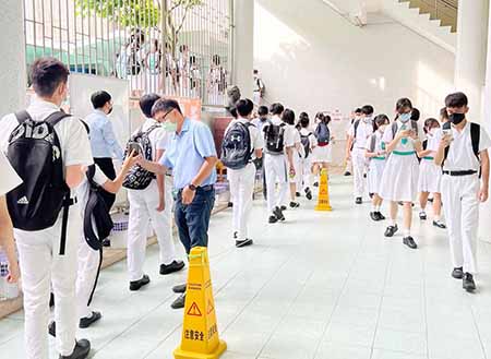 大部分家長和學生提早出門,選擇步行或乘搭公交出行,減輕開學時段的交通壓力;而學校亦安排教職員於校門外疏導人流,為所有進入校園的師生測量體溫,檢查健康碼和核酸檢測資料,使用搓手液清潔雙手,有序進入校園和課室,整個過程運作順暢。
