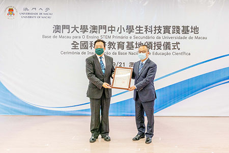 儀式上,中國科協黨組副書記、全國人大常委徐延豪向澳大校長宋永華頒授“全國科普教育基地”證書,及後徐延豪、宋永華、中央人民政府駐澳門特別行政區聯絡辦公室教育與青年工作部部長徐婷、澳門特別行政區政府教育及青年發展局副局長丁少雄共同為基地揭牌。
